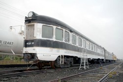 Work has continued in the meantime. The hole in the roof was addressed by taking out the old air-conditioning duct and covering the remaining hole with a piece of galvanized sheet metal sealed with roofing caulk. This should keep water out until permanent repairs can be made. While on the roof the antenna was temporarily fastened where needed. Work on the sides has also continued. All rust spots and flaked off paint areas have now been sanded and repainted, creating a 'nice' patchy look on the car. The duct tape applied in May over the cracked windows turned out to be of bad quality as most of it had already peeled off. This was all replaced with better quality clear duct tape which should hold quite a while longer. The makeshift grab irons on the skirting at the round end were replaced with the original stainless steel grab irons. Inside the car the last part of the restaurant ceiling was removed and turned into a pile of wood. The only part saved was the original backlit St. Nicholas Mountain sign. Removal of the ceiling revealed the top part of the original bulkhead separating the lounge room and the bar room. During the conversion workers had just torched through the bulkhead. It remains to be seen if the remaining part can still be used or that the entire bulkhead will have to be rebuilt. Efforts to gain access to the water damaged areas at the smaller patch in the side revealed that the wainscoting underneath the windows is still the original Red Birch Formica! The fake leather material that the restaurant used was glued straight onto these panels. It appears that it will be possible to reuse the original wainscoting as the fake leather peels right off and the glue underneath releases reasonably well. It was already apparent that the windows around the patches had at one time been removed and reinstalled. What was not readily apparent before was that they were reattached with only a few screws. More screws, stainless steel ones this time, were added to more securely fasten the windows and to make them more water tight. St. Nicholas Mountain also received its first original part. Donated by Eric Hopp an original Adlake coat hook was mounted at its original location on the wall of the former car attendant's roomette. More parts to follow... Finally a small workbench was constructed at the vestibule end, a fire extinguisher mounted and a first aid kit hung. This concludes more or less Phase I of the restoration process. St. Nicholas Mountain is now ready for the bigger repairs. Next year will be all about windows...